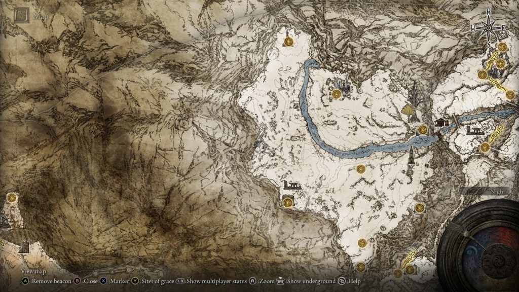 This will warp you to Moghwyn Palace, Mohg’s underground headquarters. You’ll land on the Palace Approach Ledge-Road site of grace, and won’t get the map below to guide you. My recommendation is that you call Torrent and just move toward the spot I marked in green. The enemies between you and that site might look daunting, but I doubt you’ll have much trouble getting there.