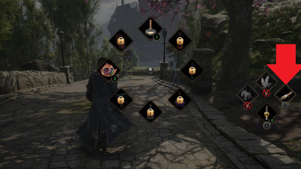 Once you have your broom, from here on out, you can fly in specified outdoor locations. Note: that includes basically anywhere in the open world, with the exception of indoor locations, dungeons, and much of Hogwarts. To fly, hold L1 to open up the inventory wheel, then press Circle (B on Xbox).