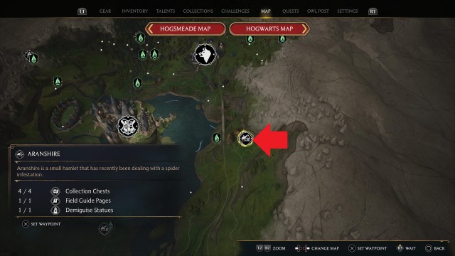 First, you’ll want to head to Aranshire and speak to the NPC Edgar Adley to pick up the quest. Aranshire is east of Hogwarts: the exact location of the sleeping hamlet can be found in the gallery above.