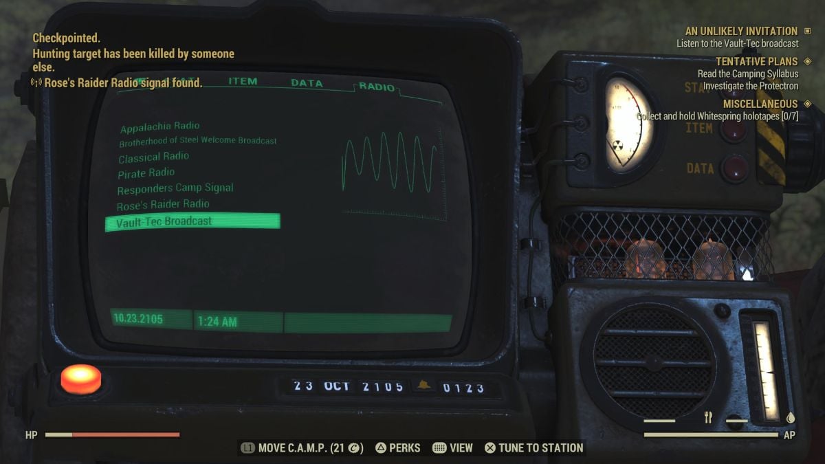 You’ll pick up An Unlikely Invitation when you next launch Fallout 76. The quest is automatically added under Main Quests on your PipBoy. You should open it and track it so you can follow each step as it evolves because this one involves a lot of trekking across the map. However, first, it’s time to turn on your radio and figure out what’s going on in the Appalachian Wasteland that’s got so many people worked up.