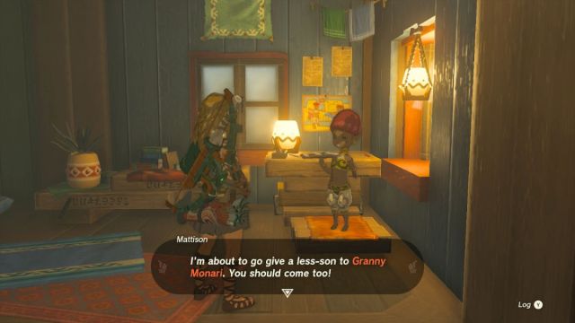 Monari tends to hang out at the bench near the entrance to Tarrey Town, by the goddess statue. You’ll get a little quiz on Gerudo language here, which you can brush up on by looking at Mattison’s notes in her room before heading out. You’ll be asked what the word for grandma is; which is “Vaba!” — the only correct answer.