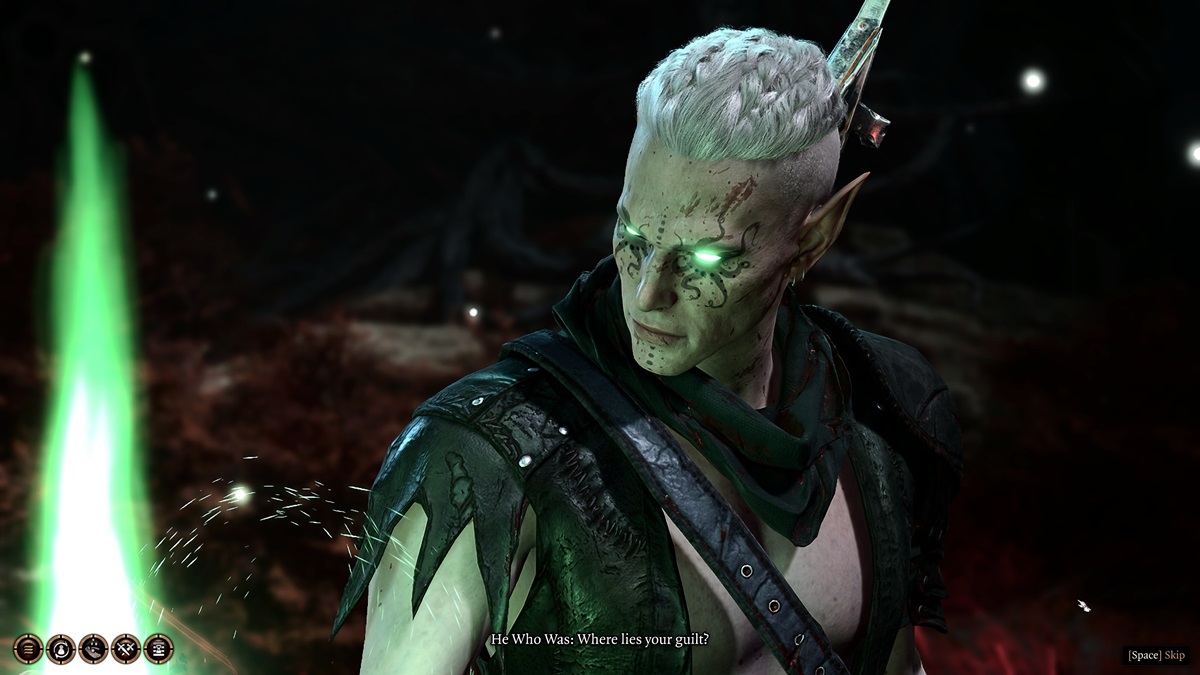 Finding He Who Was, the player is confronted by the scene of a ritual. The justice-seeking elf is apparently summoning the spirit of a barmaid called Madeline, who he claims is guilty of murder. He Who Was initially tries to drive away the player and their party, but he can be persuaded to allow you to help solve the case. He asks you to find Madeline’s ledger, where she’s kept a record of all of her patrons.