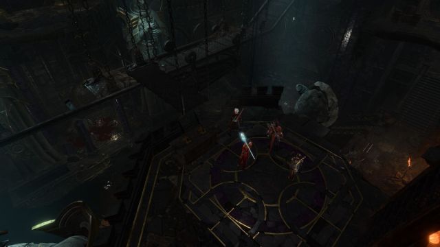 Once you see a ladder, head down and you’ll find a movable platform next to a walkway, along with two levers. The levers adjust the height and position, letting you easily set up a way to hop onto the center walkway. Remember: you can hit levers with ranged attacks to activate them. That will be very useful very soon.