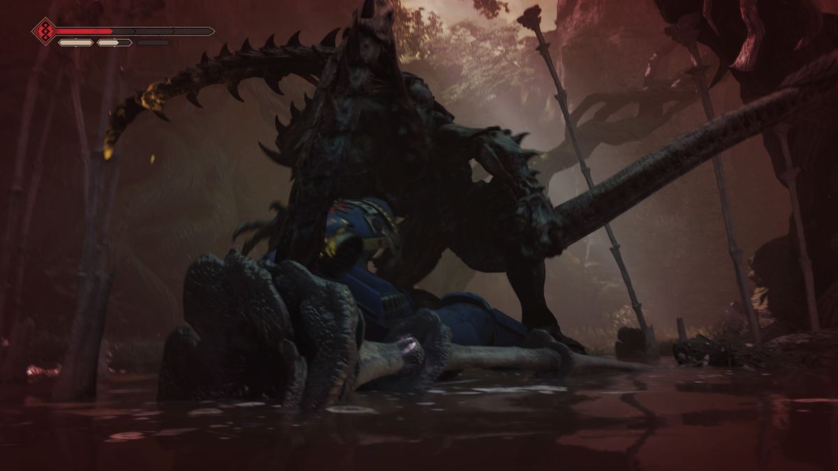 The Lictor can camouflage anywhere and is almost completely undetectable. It likes to hide in the trees in this arena and leap down to pin you and quickly whittle away armor and health and kill you. Try to avoid getting caught by its unblockable attacks, the ones that are broadcast by a red icon and arrow, because they’re the ones that will cost you your life.