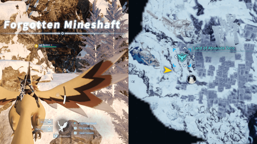 The fastest way to get here is to fast travel to the Land of Absolute Zero and head South-West towards the giant skeletal carcass below. The entrance to the Forgotten Mineshaft is on the Western side of the mountain.