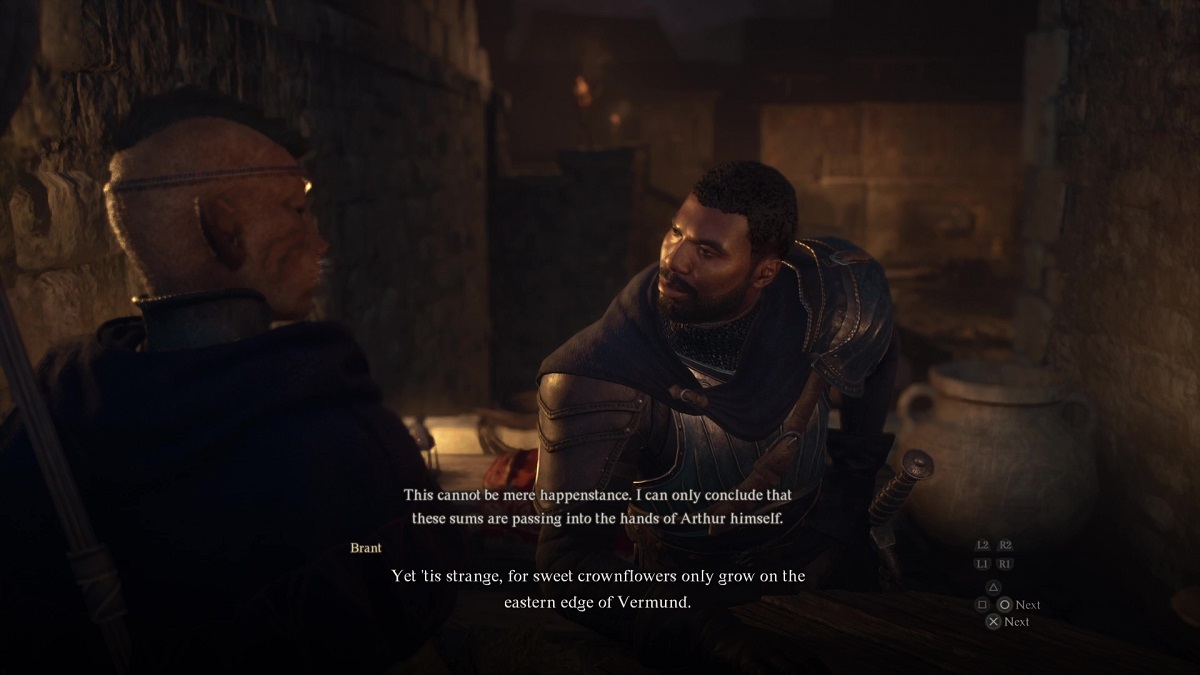 You’ll come across The Nameless Village quest as part of the main questline in Dragon’s Dogma 2. When you speak with Captain Brant, he’ll give you a selection of quests. If you choose the option “Tell me of the false sovran” he’ll tell you about hidden payments funneled to Arthur through the supposed purchase of sweet crownflowers. These are only found in a village on the far east of Vermund.