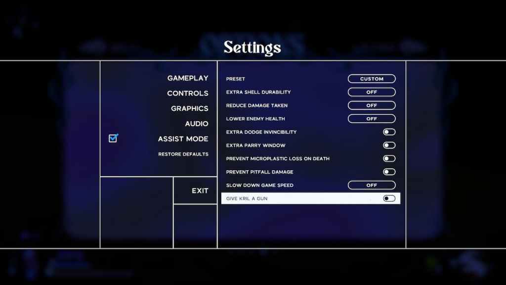 Anyway, to get the gun, just pause the game and head to the settings menu. Here you’ll find a section called ‘Assist Mode’, click on that. Here, you’ll find a number of assistance features, the last of which simply reads ‘Give Kril a gun.’ Check the box and your crab will suddenly have a life-like pistol for a shell, which shoots bullets that instantly kill enemies.