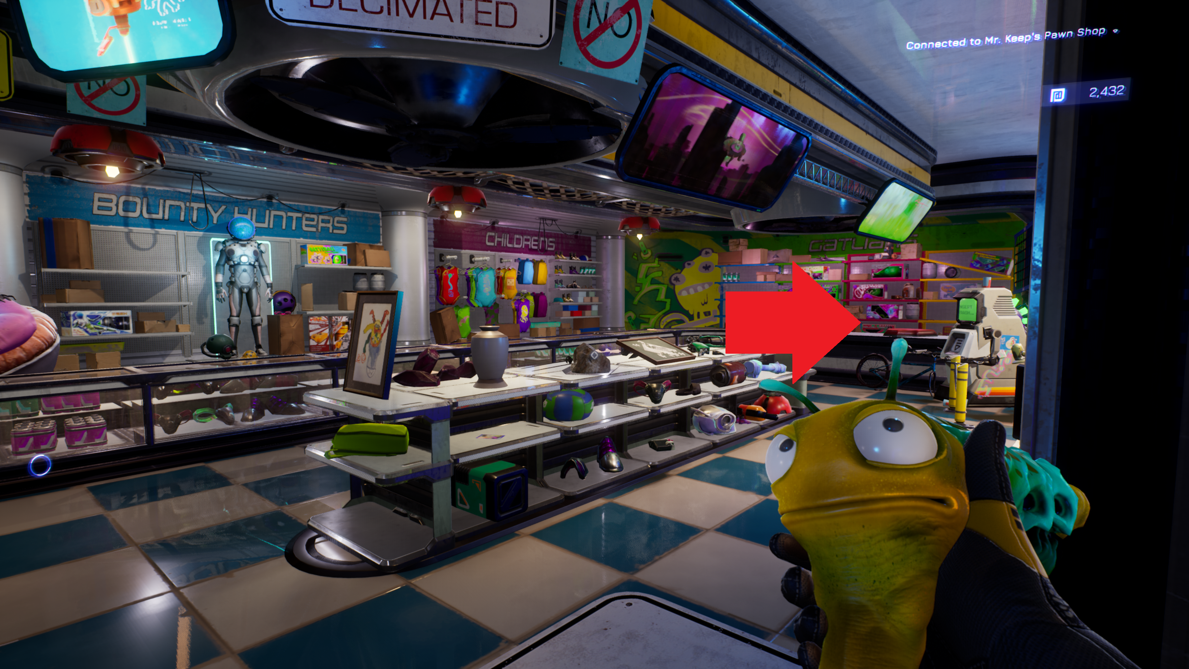 After completing your first bounty (9-Torg), an alien man and an alien kid will appear in the Blim City streets. This location is directly to the right of Blorto’s hut, facing the right side of the city when looking at it directly from your home.