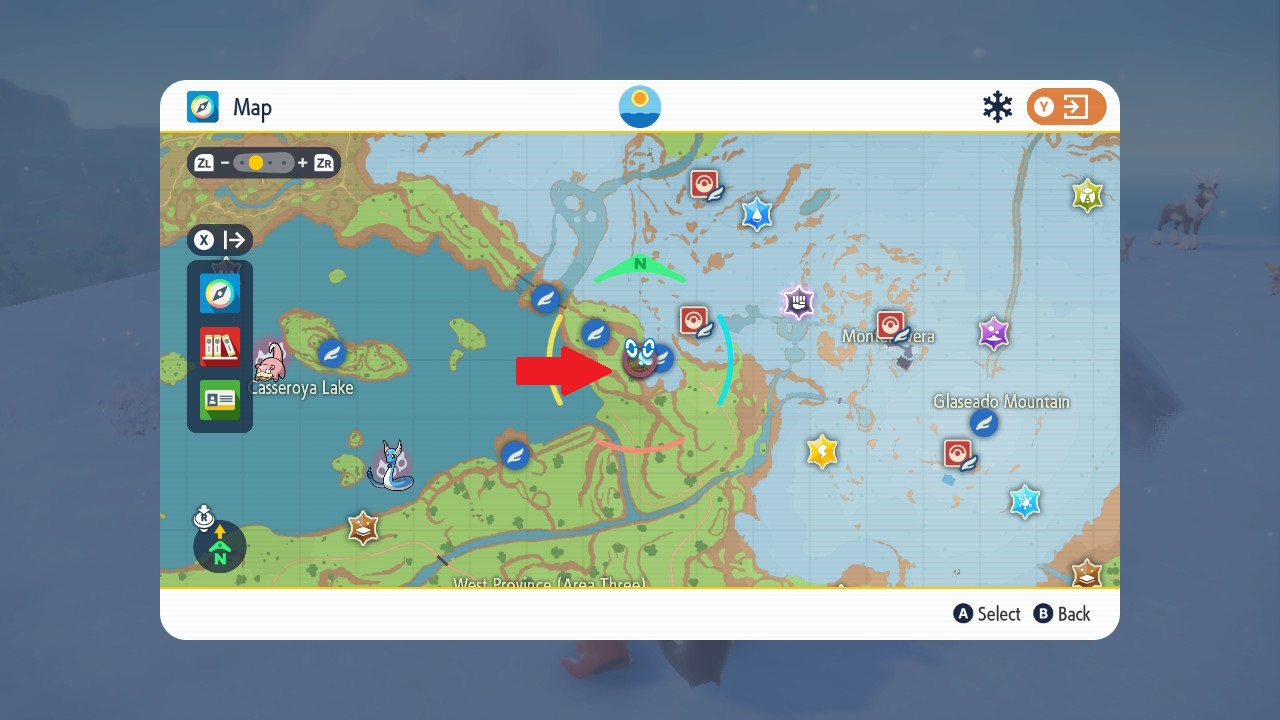 You’ll find Ice Stones as random sparkly drops on the ground in Glaseado Mountain: the region in the north of Paldea. The appropriate spots that Ice Stones can appear are marked by snow on the world map.