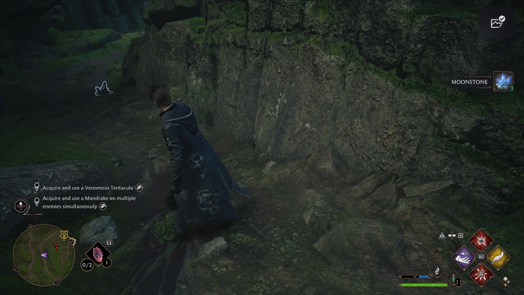Eventually you will run out of your finite economy of Moonstones, so you may want to take to the open world to look for them, and increase your cache. Typically, they can be found near mountainsides, and require a basic cast to break apart. For reference, I found some Moonstone in the ravine at the location in the gallery above.