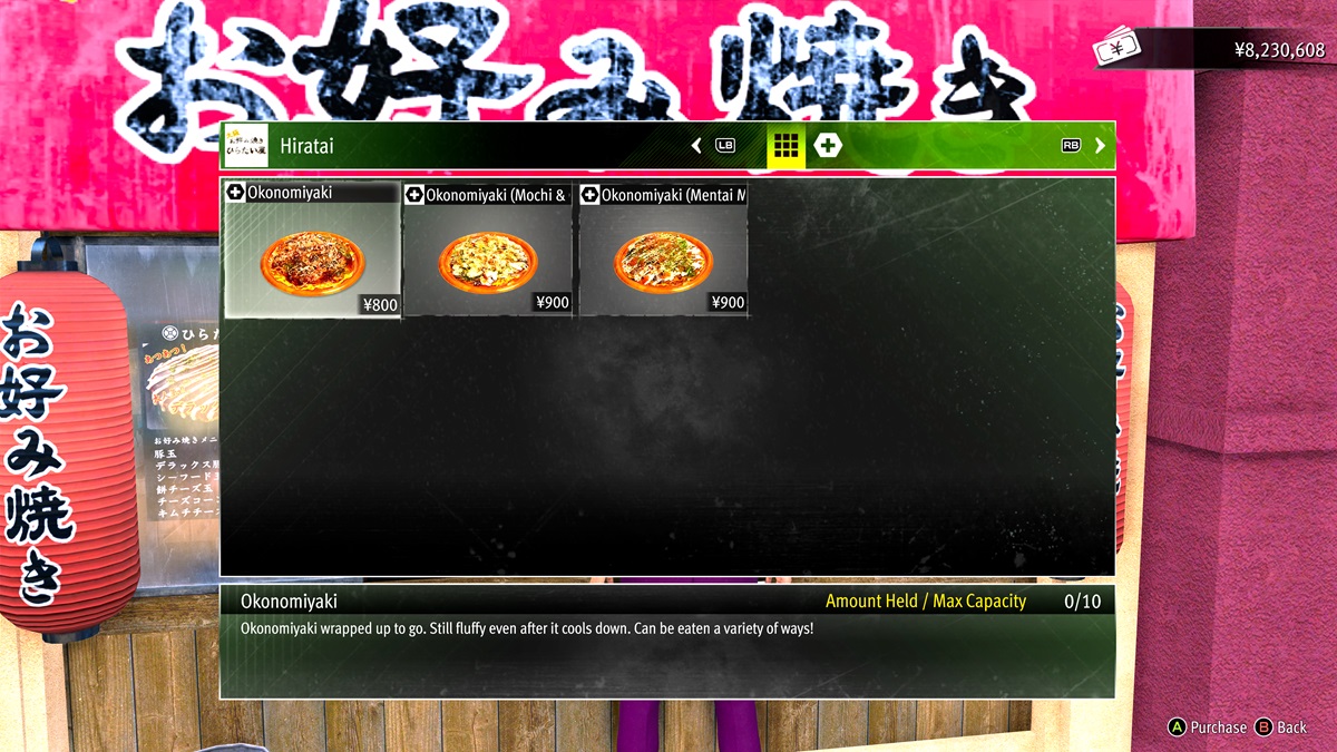 Upon reaching Hiratai, players can choose between traditional okonomiyaki for 800 yen. The mochi and mentai variants cost 900 yen, so it’s not expensive. It’s also purchasable in bulk, potentially giving Kiryu several dozen to munch on during battle.