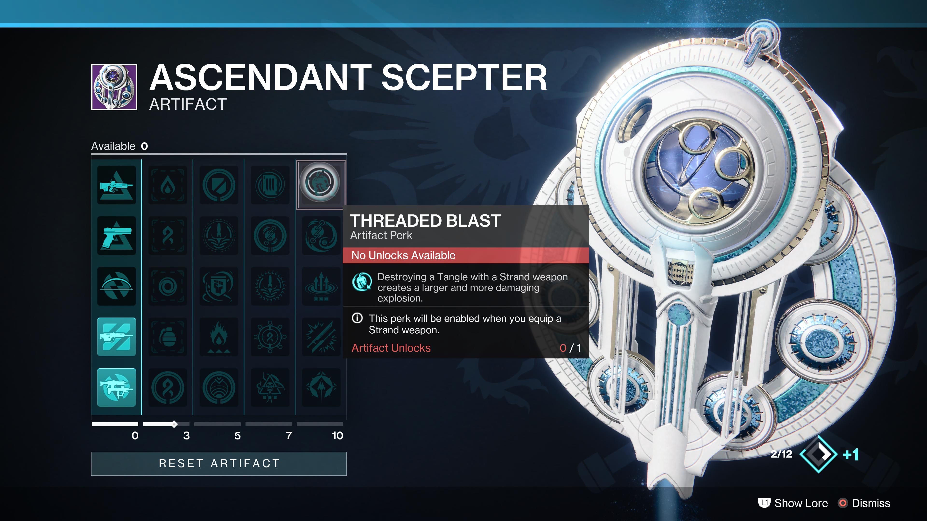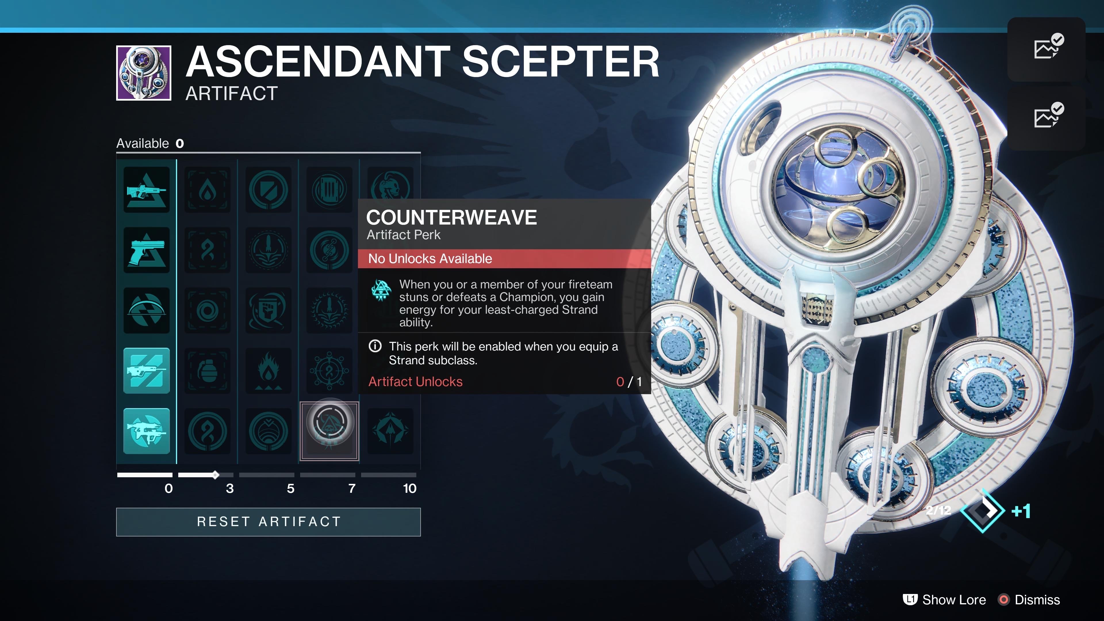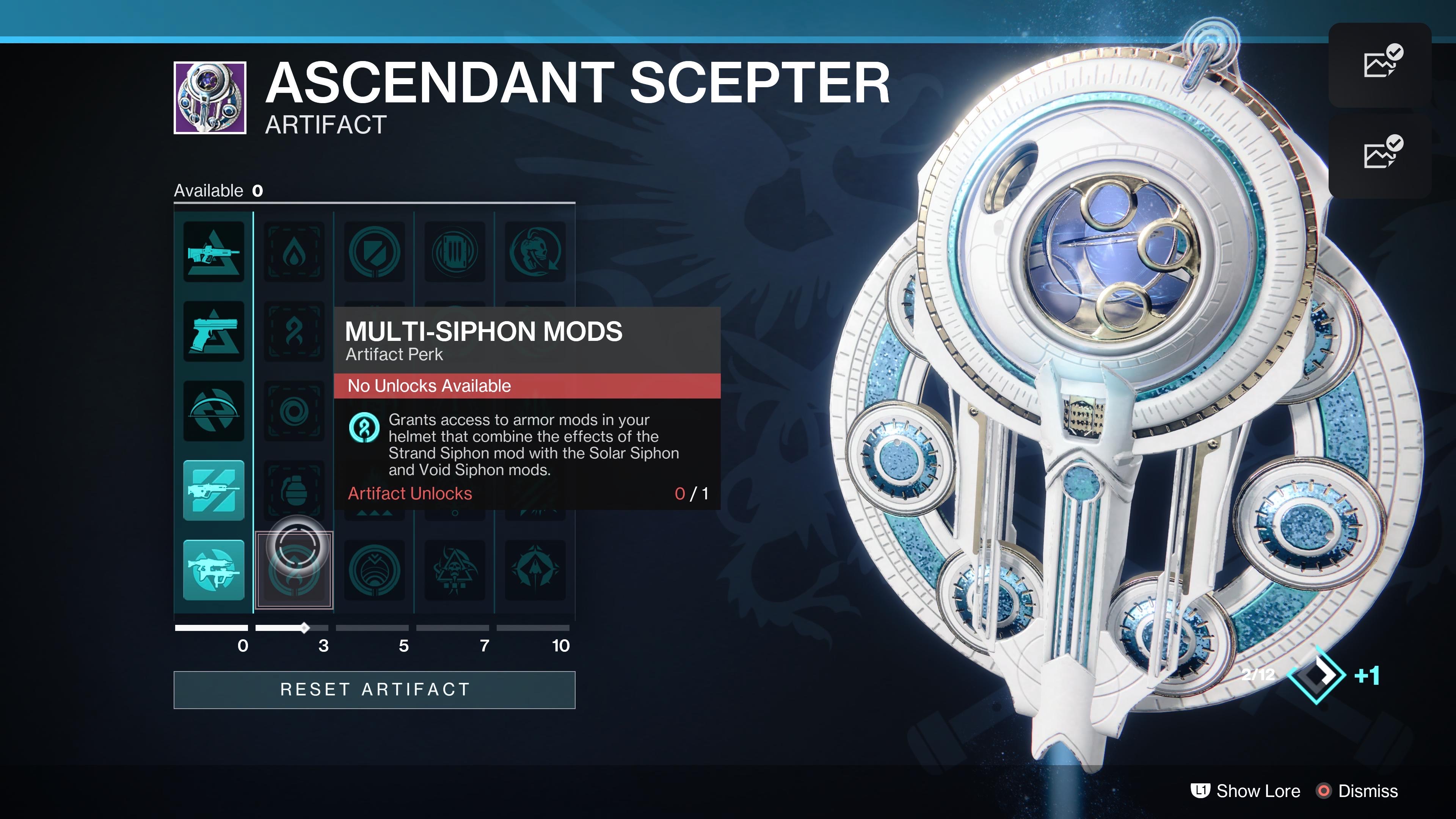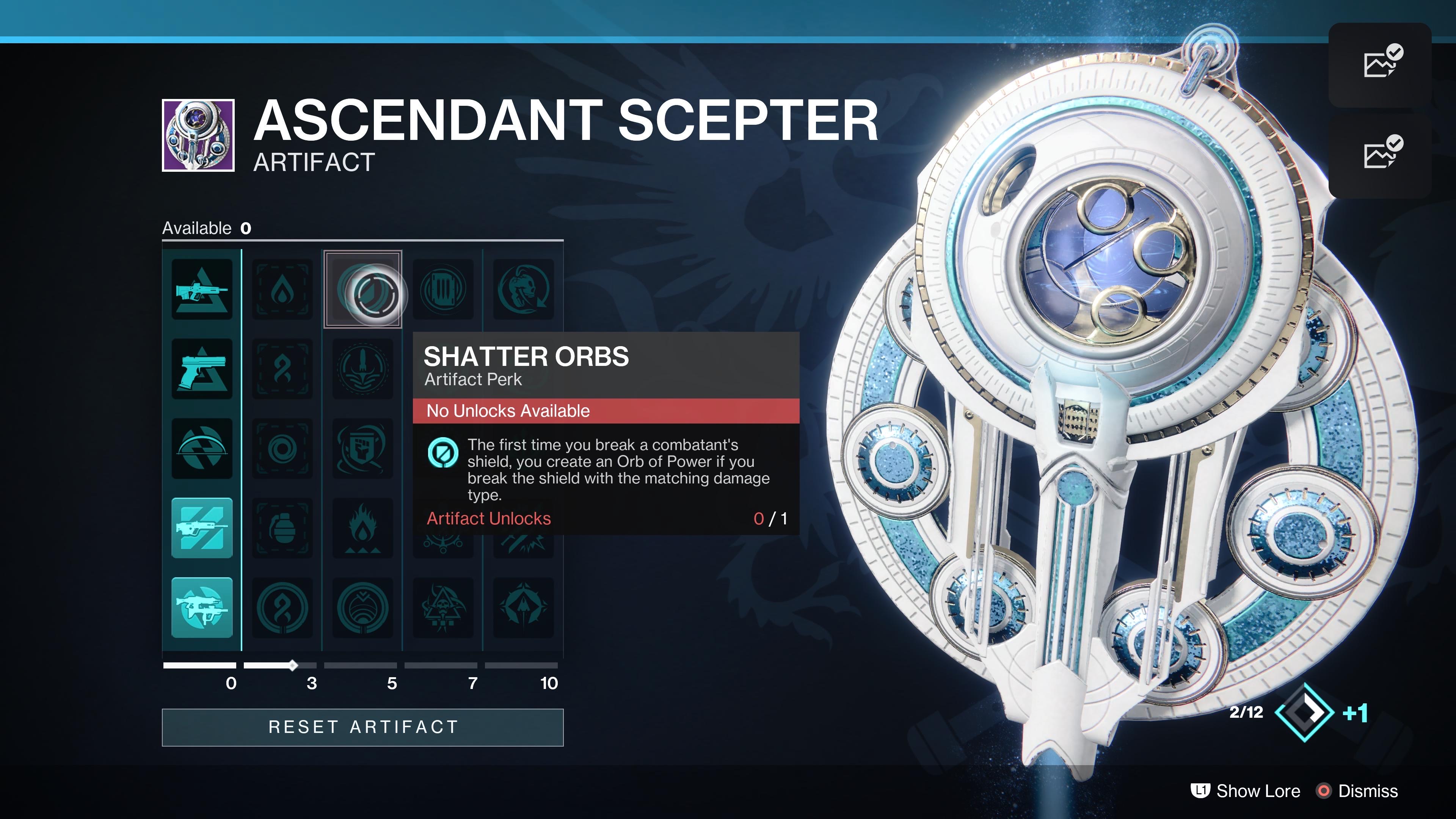 To reset your Ascendant Scepter perks, preview the artifact on the gear screen, and scroll to the “reset artifact” button on the bottom.