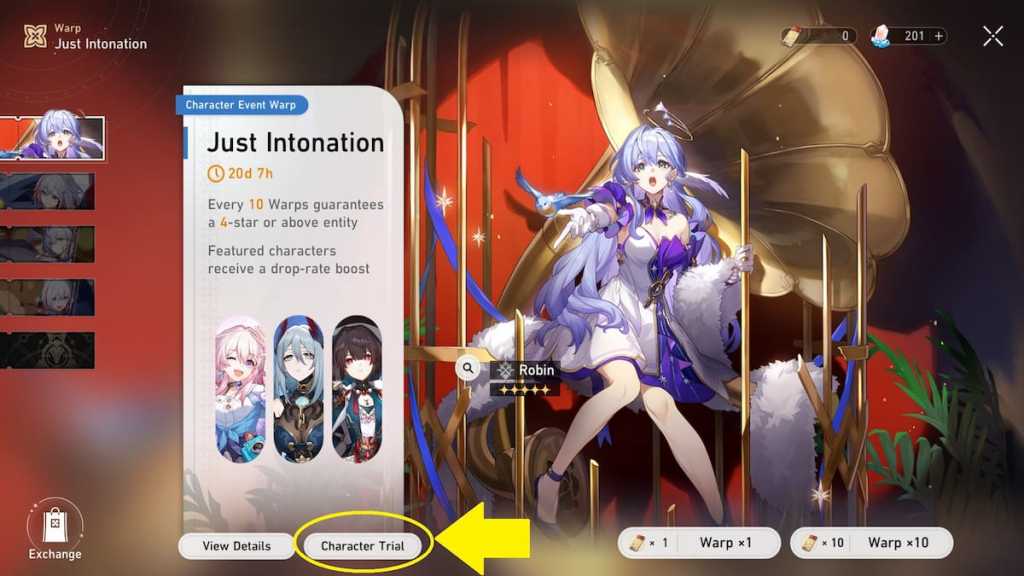 If you’re new to Honkai: Star Rail, every time a new character is released into the game, you have access to their Character Trial, and with Robin this is no exception. To access her Trial, open up the Warp menu and click on Character Trial down at the bottom.