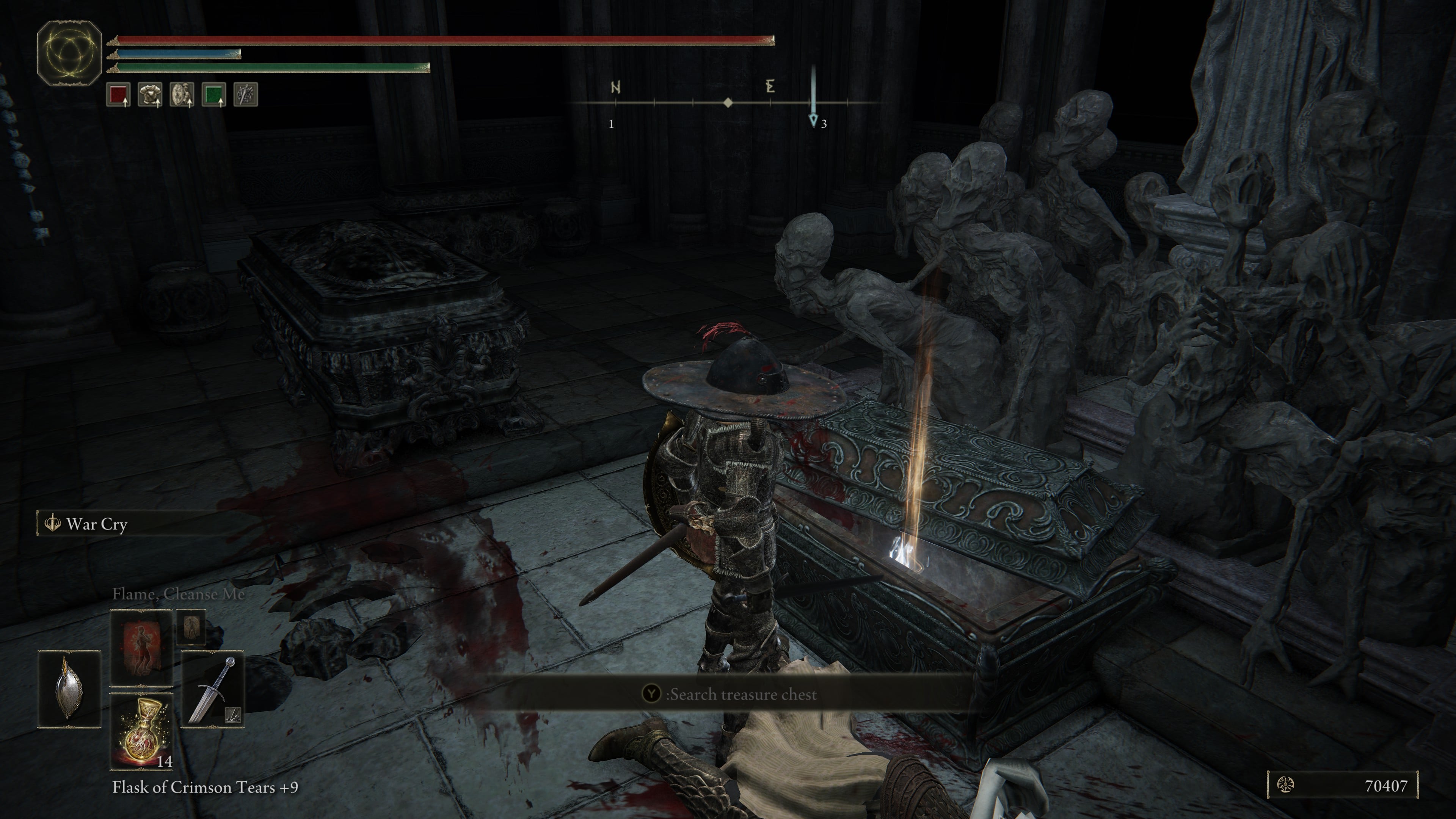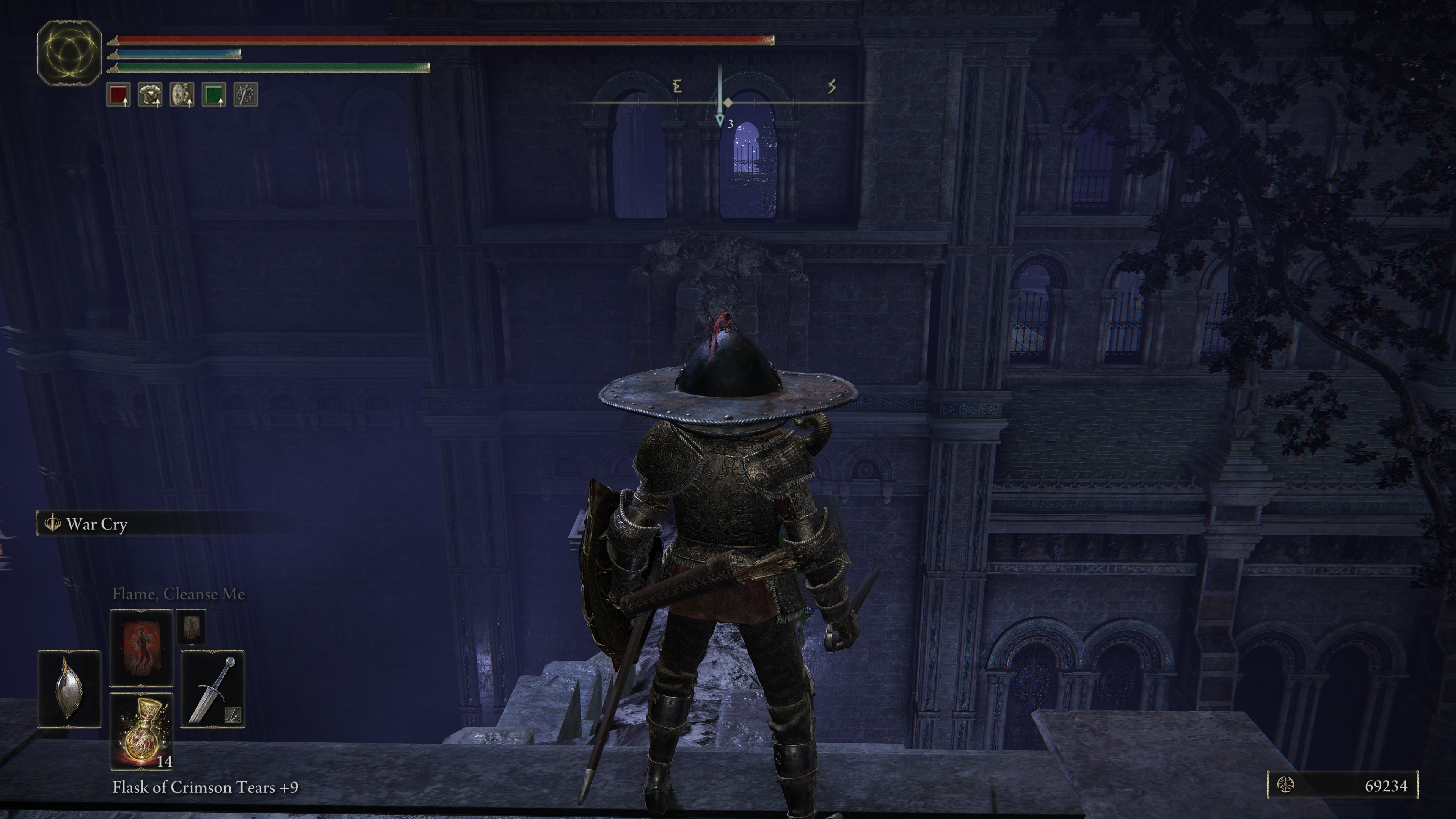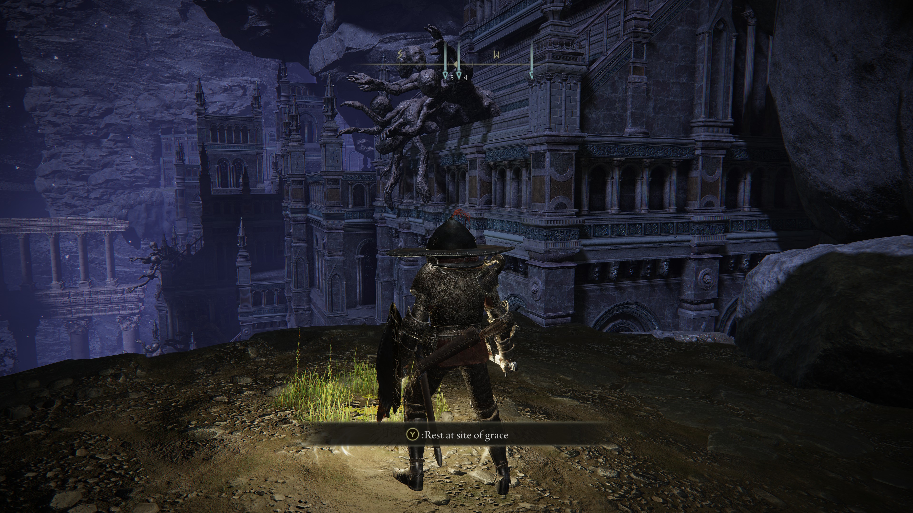 Head down into that abyss using the rock pathways and ledges, until you come across a Site of Grace (bonfire) for Nokron, Eternal City. When you see enemy puddles (mimics), you’ll know you’re in the correct place. Go directly east until you enter a building right in front of the main path following the Site of Grace.