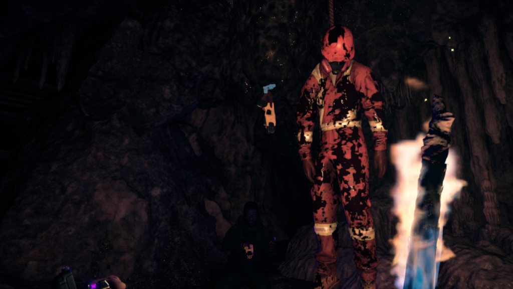 Now, while you’re supposed to follow the water and go left here, I’d recommend going right first before backtracking to this point. If you go right, you can find a body hanging from the ceiling and this is where you find the Stun Gun. However, the right path is filled with a lot of enemies, so make sure to only go this way if you’re equipped and ready for a fight.