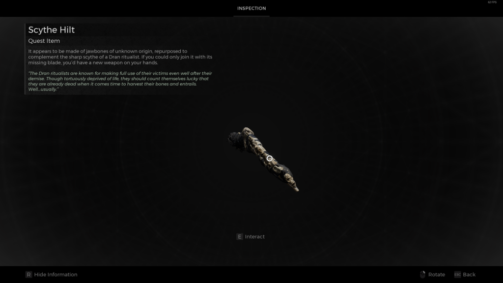 With both pieces in your possession, open your inventory and choose to inspect the Scythe Hilt. Move it around on the screen until the top part is facing toward the screen, and you will see an interact button pop up as you see in the screenshot above. Push the interact key and it will ask you which item you want to combine with the Scythe Hilt.