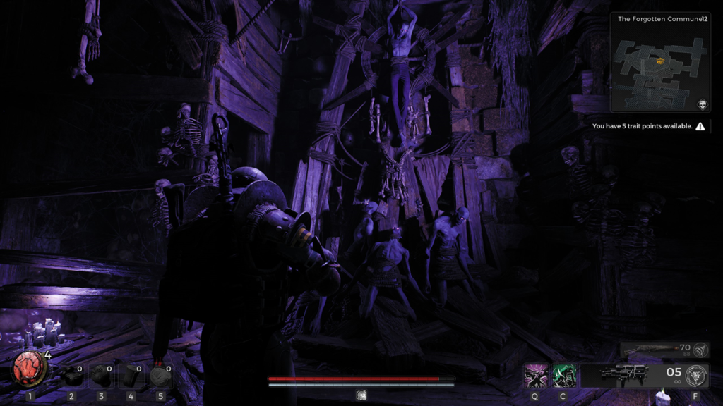 The first step to creating the Ritualist Scythe is to collect its two components: Scythe Hilt and Scythe Blade. Start by heading to The Forgotten Commune. Progress through the area as normal, until you reach a spot where you can head down some stairs into what looks like some sort of ritual room lit with purple candles. Go figure, right? Once you delve further into this room, you will see several people tied to a makeshift altar. This is actually a boss called the Befouled Altar.