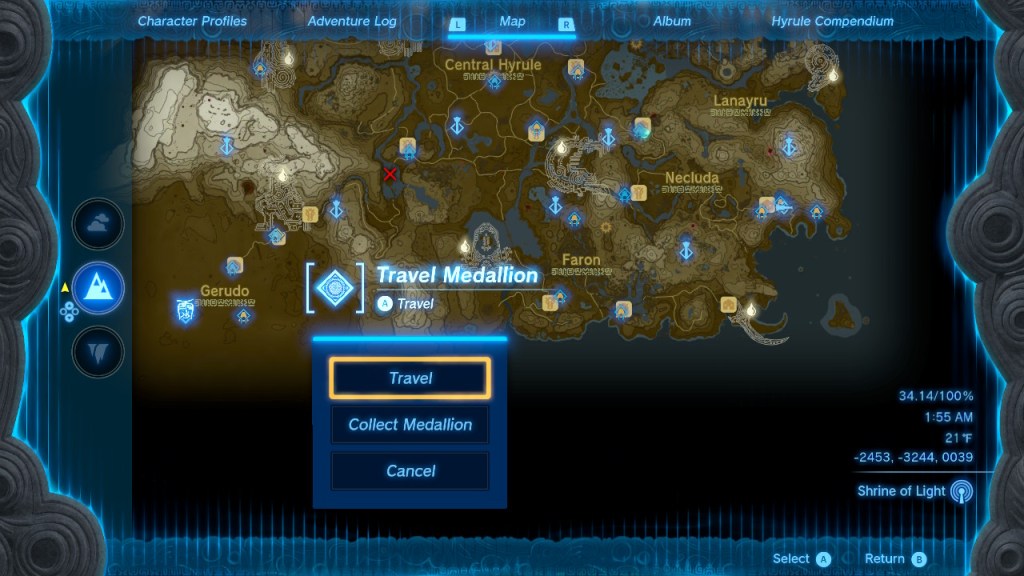 To return to that spot, you just need to open up the map, find your Travel Medallion, and select “travel” to teleport there. If you want to remove it, select it on the map and press “collect Medallion.” Note that Medallions can be placed basically anywhere in the game, even in the skies and in the depths. Of course, you can upgrade it two more times to add more maximum portal slots.