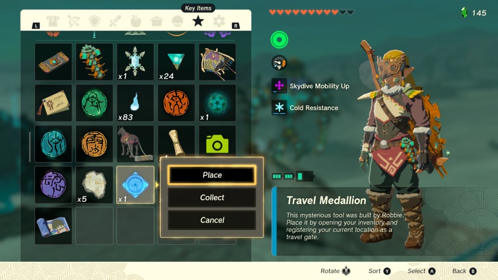 To use the Travel Medallion, all you need to do is open your inventory (+) and select “key items.” Move the cursor so you’re pointing at the blue Travel Medalion icon (pictured above), then select it. Select “place” to put it directly on the ground. It’ll look just like the icon. Congrats!