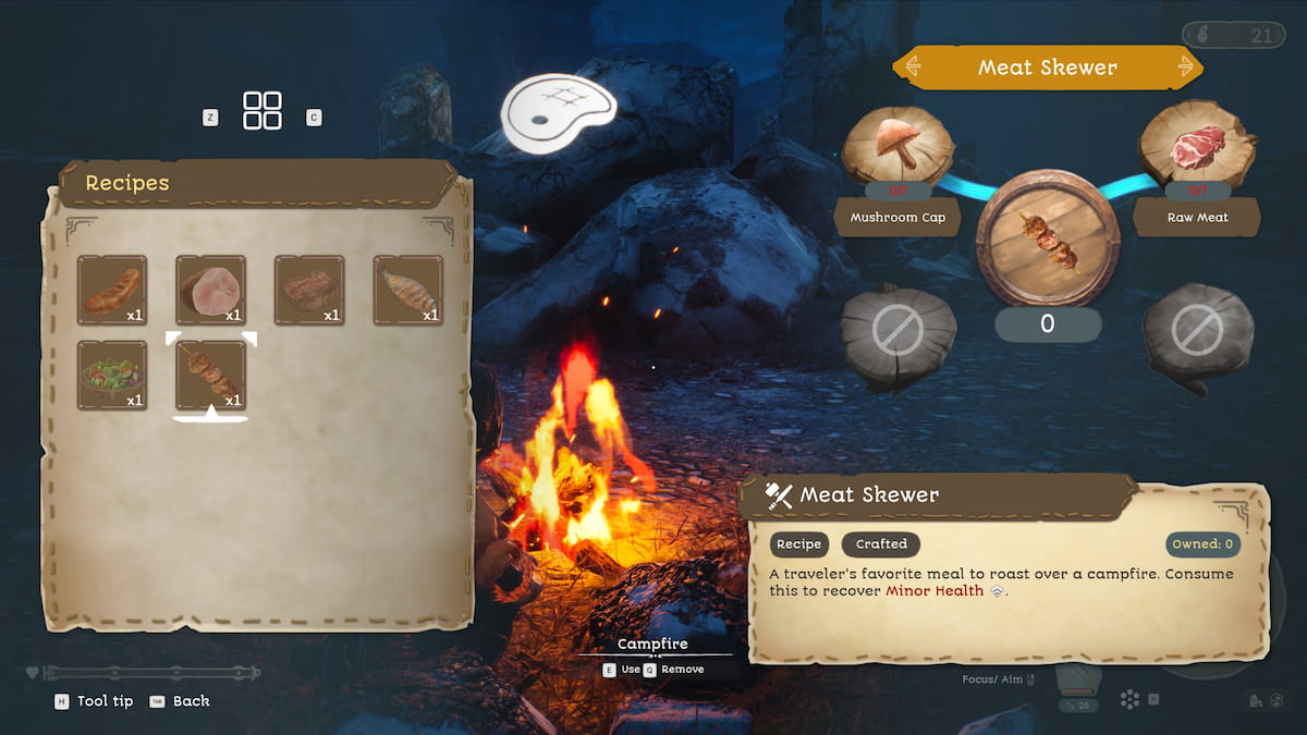 The first three are fairly self-explanatory, but I’ve included the methods to obtain them in any number. The most concerning resource requirement for the Lutoro Bridge is the final one, which appears to you as a randomly selected food-related resource. For me, it was a Meat Skewer, which I was able to cook using a Campfire. For a friend of mine, it was a Nutritious Salid, also cooked with a Campfire.
