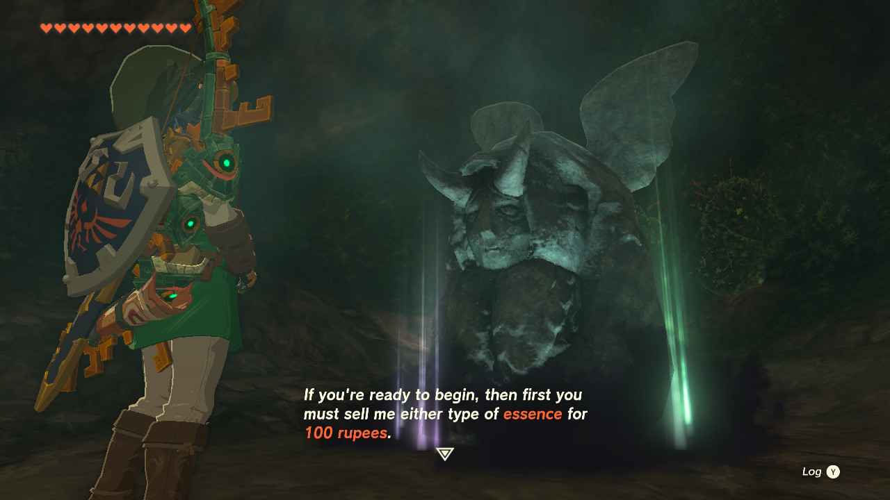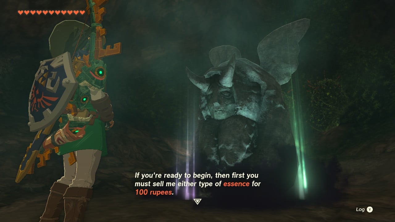 Following that, the “Who Goes There?” quest will pop and you can speak to the statue a limitless amount of times. It’ll take one essence from you again and gift you 100 Rupees, then “charge” you 20 Rupees to change it back into a heart container or a stamina bump. Repeat this to your heart’s content!