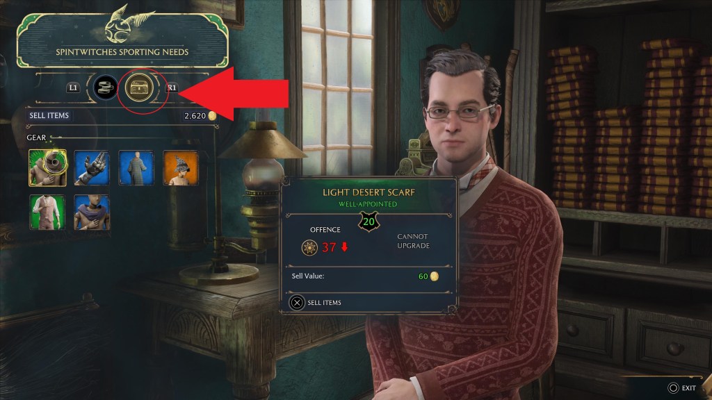Go to Hogsmeade, walk into any store with a unique icon, and talk to the NPC. Press R1 (RB on Xbox) to change the tab from “buy” to “sell,” then offload all the gear you can that’s a strict downgrade from your current gear. You’ll be able to tell because of the statline notification, which indicates red for lower than your current equipment, and green for gear that’s an upgrade. If something is green, check it first and potentially equip it before selling it.
