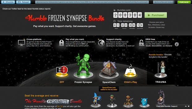 The Humble Indie Bundle is a really inspiring thing to see happen right now; it shows that there’s a lot of gamers out there who are really interested in playing indie games on multiple systems and that gamers want to support indie devs, and organizations like Child’s Play and EFF.