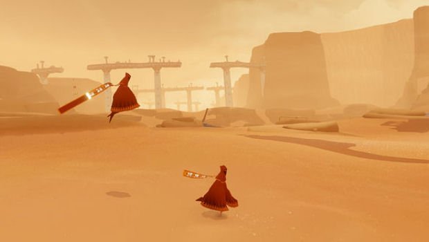 Co-op games often cause me to lose interest in a game. It’s hard to follow a story when you’ve got someone chatting in your ears, and it’s hard to enjoy a game while worrying about looking “bad” in front of another player. Journey, by stripping players of communication and identity, by placing them in a world where they simply explore together, has sidestepped all the usual issues of co-op gaming.