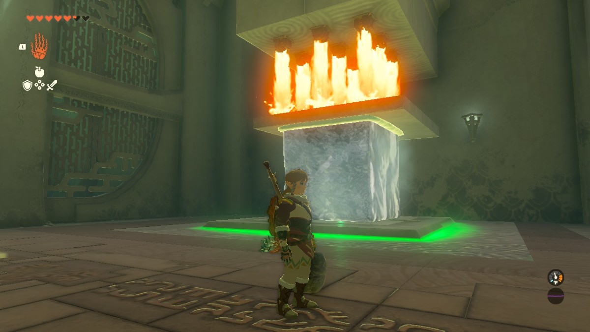 After opening the chest, you can take the block of ice with the plate attached to the flamethrowers at the start of the shrine. At the bottom of where the flames are firing is a large pressure plate, similar to the kind that opened the first door. But you can’t just place the ice on the plate since it will melt.