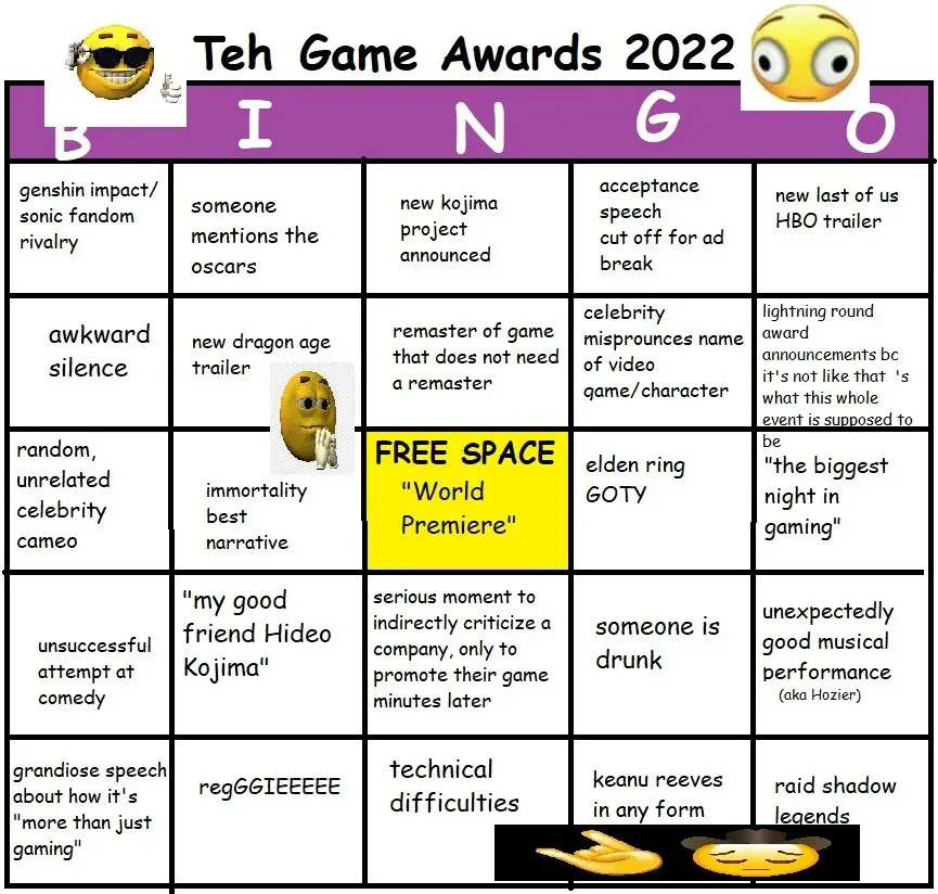So, I brushed off my immaculate MS Paint skills and made a bingo card for this year’s 2022 Game Awards, because let’s be honest, it’s gotten pretty predictable at this point. New trailers, mispronunciations, and Geoff’s mention of Hideo Kojima are basically all givens, but I wanted to throw some wildcards in there too.
