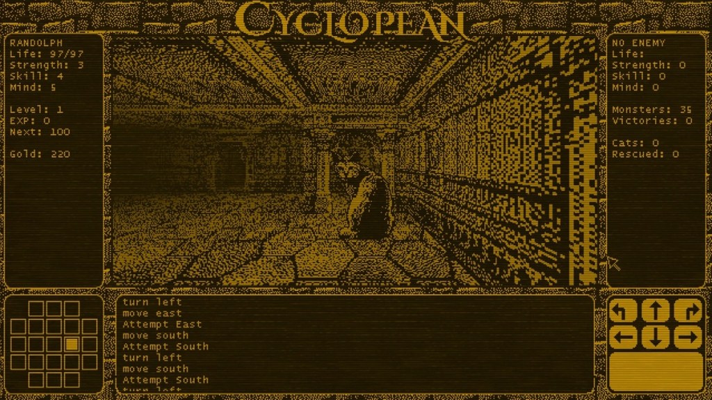 A free demo is available via Steam, and it’s a tiny download, so you’ll be in-game before you know it. The crux of the experience is Cyclopean‘s obvious Ultima gameplay loop. This is a full-fledged old-school CRPG that plainly states it’s been heavily inspired by the likes of Ultima and Questron, just to list a few. You’ve got the one-two combo of a bird’s eye exploration component with first-person dungeon crawling. The deliciously grainy graphics tie it all together with a gross, slimy bow on top.