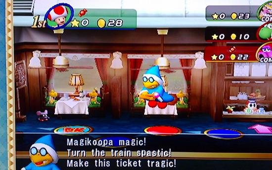 The minigame in question instructs the player to make a train shake, presumably through some manner of Wii remote-related malarkey, but while the word is used legitimately, Nintendo’s translators really shouldn’t have tried to be so impressive with the thesaurus this time. Seriously guys, I know you don’t want to incurr the mighty wrath of muscle-man Reggie, but really, sometimes less is more. Anyone for Prince Phillip as an unlockable character in Mario Party 9?