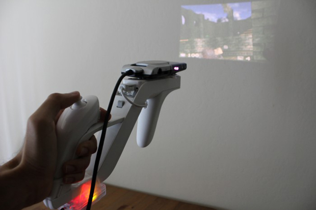 Nirav Patel took a ShowWX miniature laser projector, a Wii Remote and a Spacepoint Fusion gyrometer and worked them all onto a Wii Zapper body to make a sort of free moving virtual reality device. The end result is a gun you can aim at the walls in any room and play something like a shooter, pointing up to see up, down to see down, in full 360 degree movement. The laser part of the projector keeps things in focus wherever you point it, unlike a traditional projector.