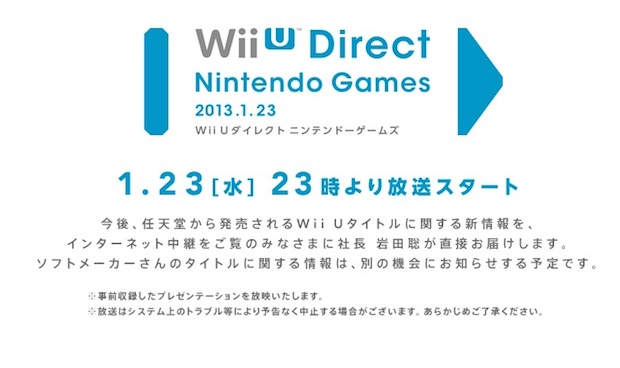 Nintendo has announced a worldwide Nintendo Direct broadcast for tomorrow, January 23. It will be a Wii U-focused affair, with president Satoru Iwata dropping knowledge on the future of their newest console.