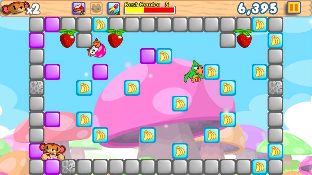 Each puzzle arena is filled with blocks — some of them are hazards, some have enemies hovering around them, and others are bananas, which you’ll want to fling into to capture. You can’t capture a block while you’re standing right next to it, so you’ll have to fling around by swiping your device until you can slam into it.