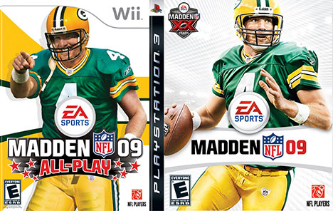 Brett Favre was the best example. The intensity for Favre on the [non-Wii ‘Madden 09’] cover — for me, it didn’t feel right for the experience I knew we were developing on Wii. So I said to the team everybody should smile on the Wii package. It embodies the experience. If you played ‘Madden’ on the Wii and you’re playing with guys with the heads the size of five watermelons, it’s hard not to smile. We wanted to be able to deliver that experience on the packaging.