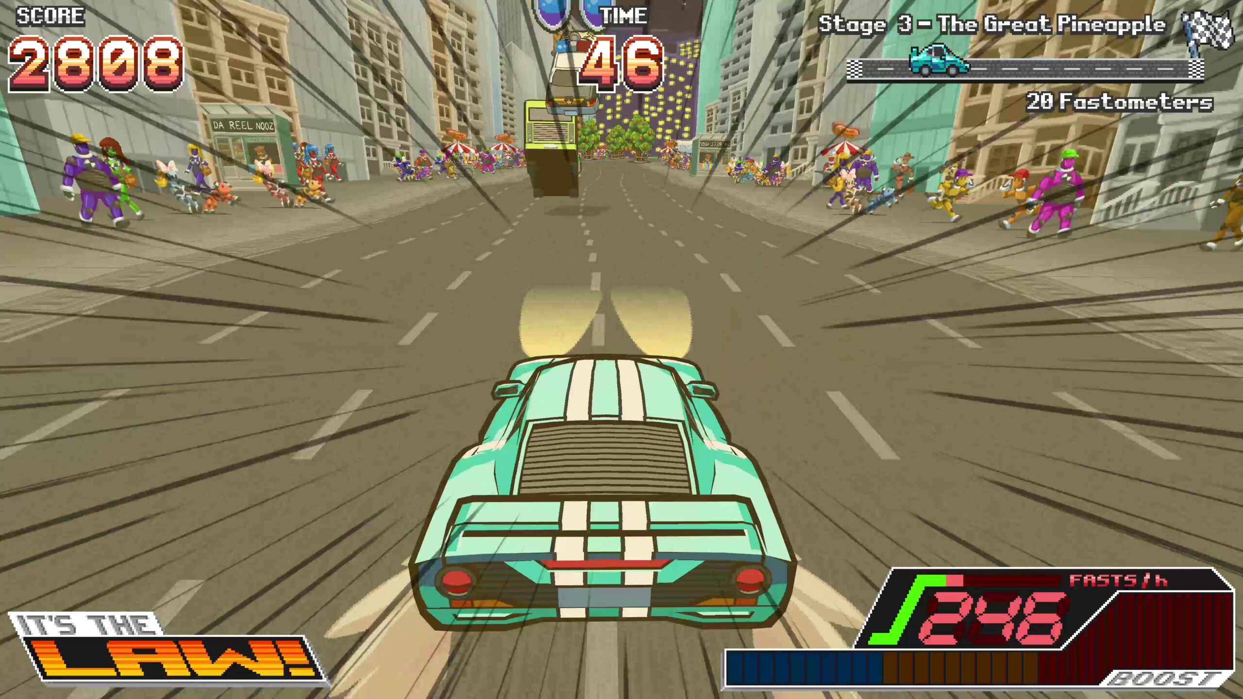 The goal in Buck Up and Drive is simple: make it to the checkpoint before the time runs out. That’s not enough, though. You have to rack up points to get to the more exotic environments and unlock new cars. That means hitting ramps, grinding guardrails, and picking fights with the cops.