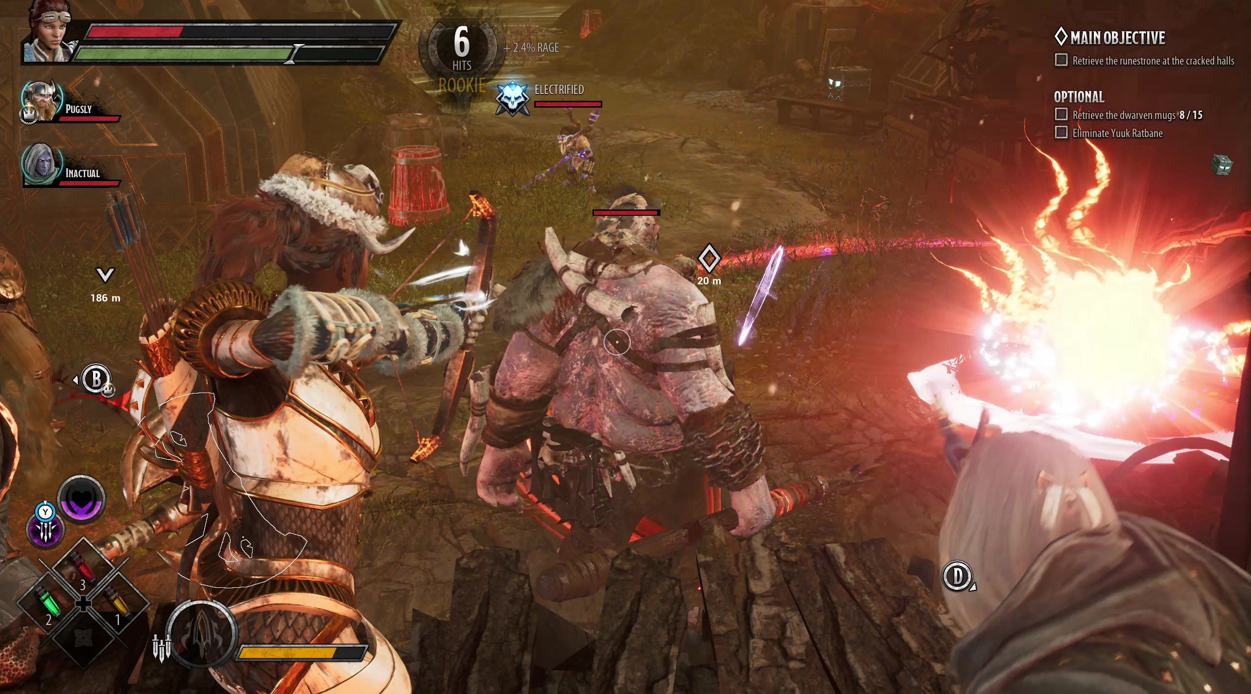 I keep calling reference to Cattie-brie because she was the only character I really enjoyed. The three other characters are melee-focused, and that comes down to a lot of button mashing. It’s not just down to misunderstanding the combat system either. Every party I was in, the other members would just rush in and start piling on a single target, mashing him to death and maybe dodging out when the big bad starts throwing a big attack. Meanwhile, I would just be sitting back and flinging arrows, kicking to death anyone who would come close.