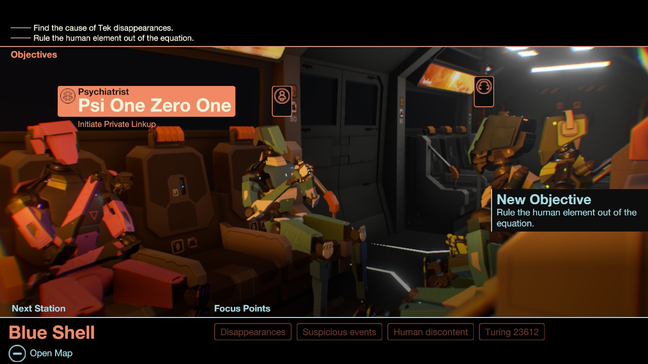 You might be wondering why that other Tek couldn’t just turn to the person sitting next to them and chat away, but all of these conversations are happening from a chat interface. The story explanation is that humans removed certain features from Teks to make them less scary and more subservient to the human cause, so no Tek has a face or mouth or makes any audible noise. This is one of the many subjects that the game tackles with its narrative.