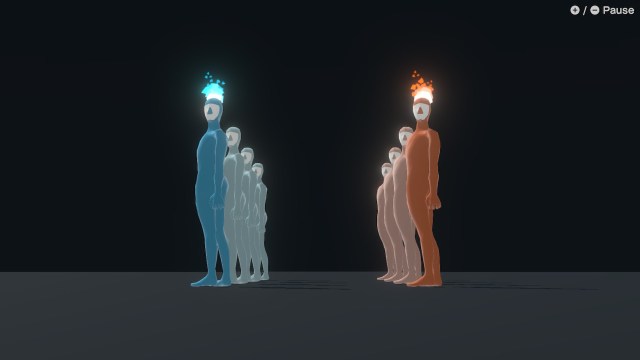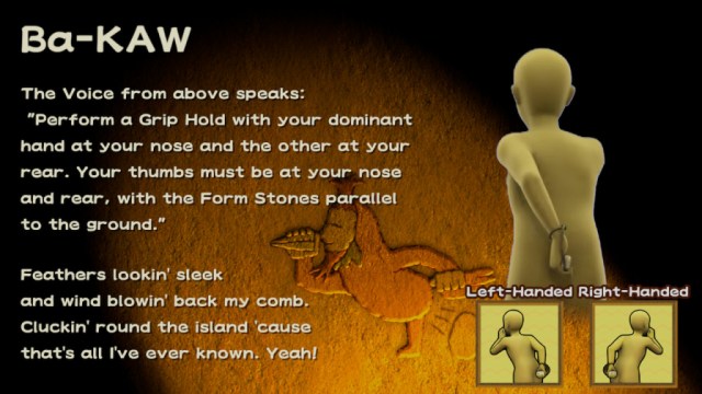 Once things do click though, the multi-form challenge runs get appropriately hectic. Like learning a VR control scheme for the first time, there is a true novelty to “weird motion controls,” and putting one Joy-Con on your nose and another on your “rear” (as the game calls it) for a chicken pose (titled Ba-KAW) is just funny. When said pose actually works the first time, it’s a blast.