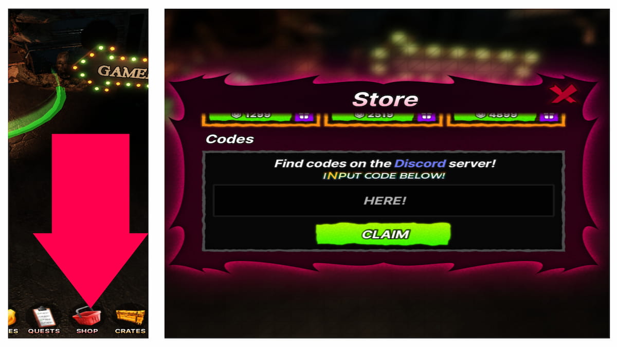 - Click on the Shop icon at the bottom of the screen and scroll down to the Codes section.