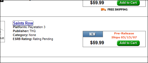 Today on the EB Games/GameStop website, a listing appeared for a Playstation 3 version of THQ’s Saint’s Row. The listing (which had the game shipping this May) has since disappeared, but it’s too late. The Internet is faster than you, THQ; make the official announcement already. Extra missions, maybe 1080p support, etc. We should all know the drill by now.