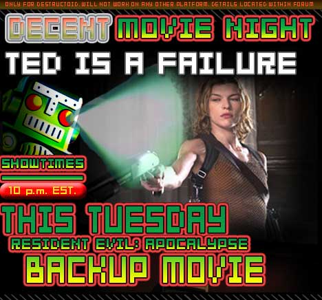 This week we were all supposed to watch the Pokemon movie, but are now forced to slightly upgrade to the arguably decent Resident Evil: Apocalypse film. I haven’t seen it yet, and I’m willing to bet it’ll be complete shit since I hated the first one, but we’ll all find out at 10 P.M. eastern standard time when the movie starts.