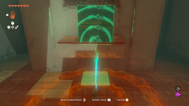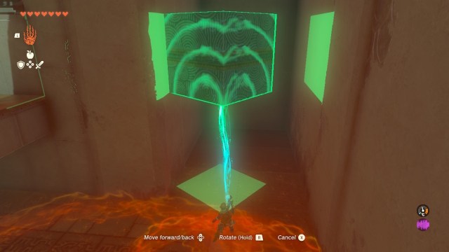 Once the cube is in position, Ascend up to the top of the large platform on the left of the room from the spot where the cube was originally. From the higher platform, you can glide down to land on top of the cube. After getting on top of it, you’ll be able to Ascend to travel up through the column to the highest level of the shrine.