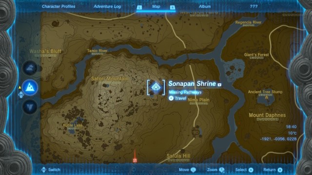 Sonapan Shrine is located in the Hyrule Ridge area of Hyrule, just to the west of Hyrule Field at the base of Satori Mountain. The closest fast travel point for most players is Hyrule Field Skyview Tower which is southeast of the shrine. To get to the shrine from Hyrule Field Tower, use it and glide northwest across Regencia River. It’s possible to get pretty much the whole way in a single glide with the maximum three stamina wheels. Otherwise, you’ll be on foot for a portion of the journey.