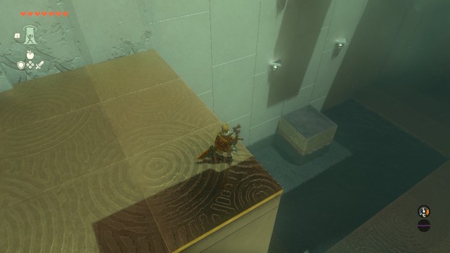 The next room is similar to the previous two puzzles, except it’s much more convoluted. You need to Ascend through the column high up on the wall opposite the entrance, but it’s above deep water. Link can’t use Ascend while swimming, so you’ll need another option. To start, take the metal cube sitting on the left side of the room and place it in the water directly under the column that’s on the wall above the pool.