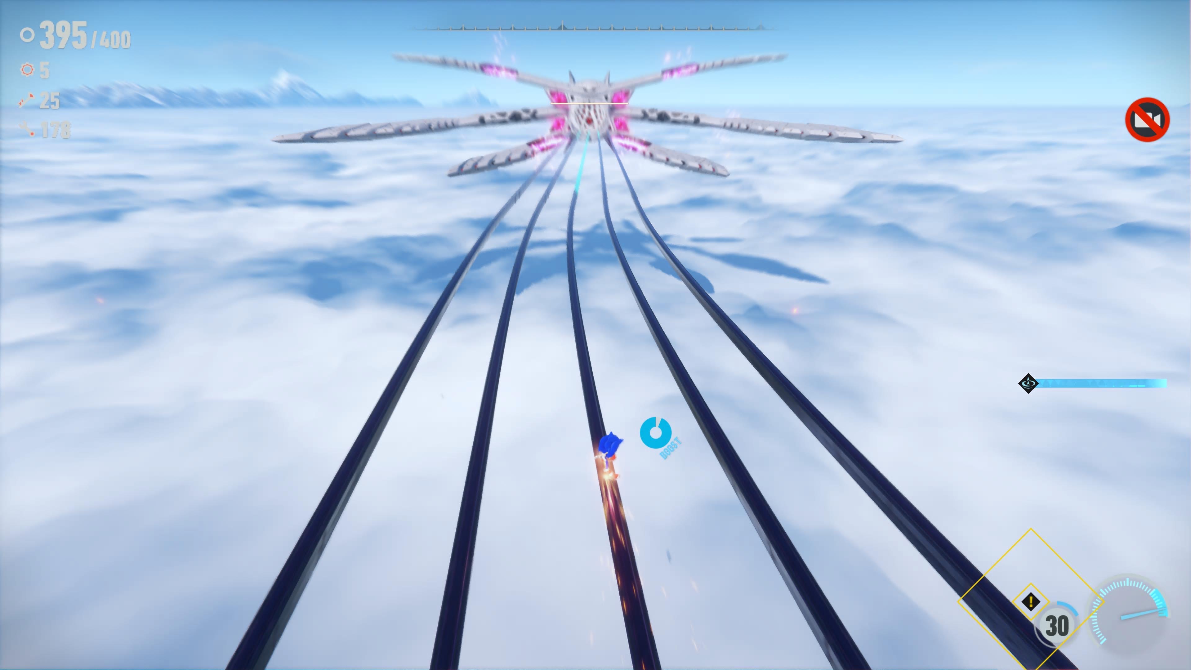 From here, everything is going to be really self-explanatory. Ride on the rails, press L1/R1 [LB/RB] to avoid the lasers (which have a lengthy tell), and make a point to ride on the blue rails as much as possible. The blue-lit rails provide you with infinite boost (R2/RT), which gets you to the heart of the Fortress quicker.