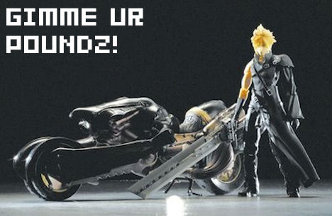According to the site, “all orders must exceed £23.00 (€29,00) (including tax) to be processed.” Somehow, I don’t think that will be a problem, considering that such trinkets as this £367.99 Cloud Strife toy are on sale. There are people in this country that are going to buy that — fact.