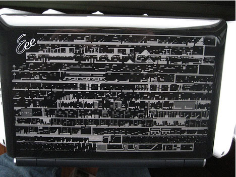 His Flickr page says that the etching on the lid of his Asus EEE pc lays out everything between World 1-1 to World 4-3 from the classic Game Boy platformer. He had this cut at NYC Resistor, where they’ll also etch your laptop for you. Check out his gallery for more pictures.