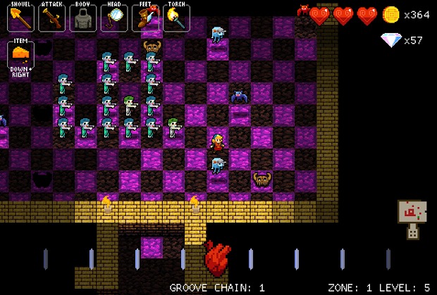 The game is controlled using only the four cardinal directions, with attacks occurring automatically upon moving toward a monster while adjacent to it. The key element is that while this is occurring, a song with a heavy beat is playing, and only moves that are executed on the beat are valid. Any panicked attempts to run off beat are penalized by essentially losing that move, opening the protagonist up to attack from nearby monsters.